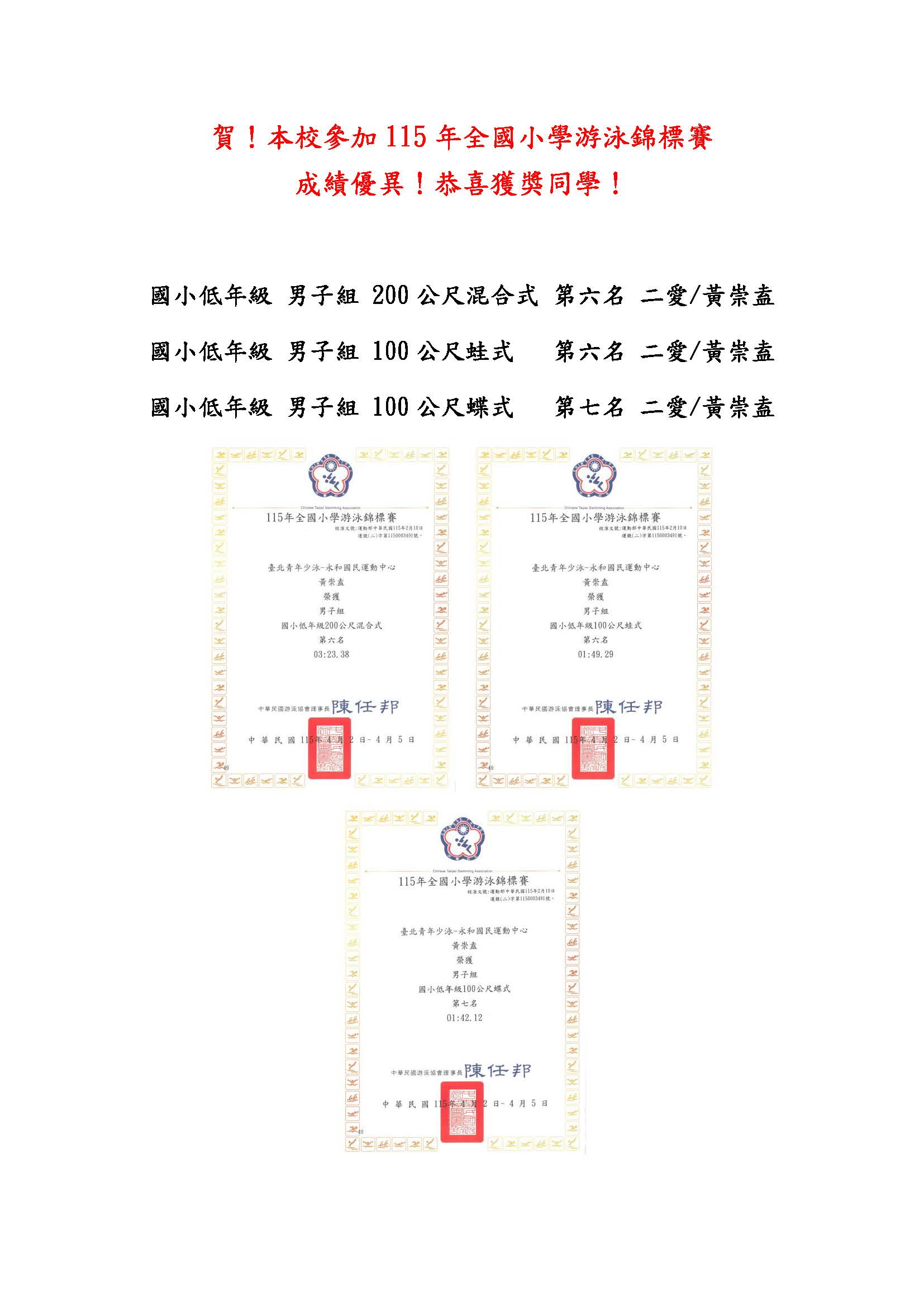 賀 本校參加115年全國小學游泳錦標賽 成績優異 恭喜獲獎同學