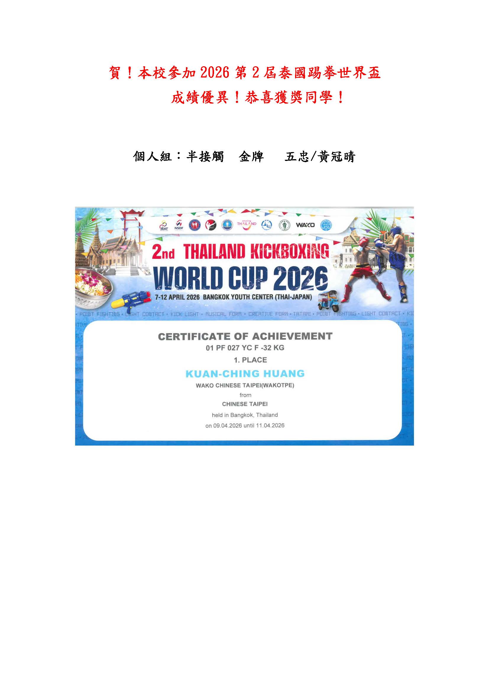 賀 本校參加2026第2屆泰國踢拳世界盃 成績優異 恭喜獲獎同學