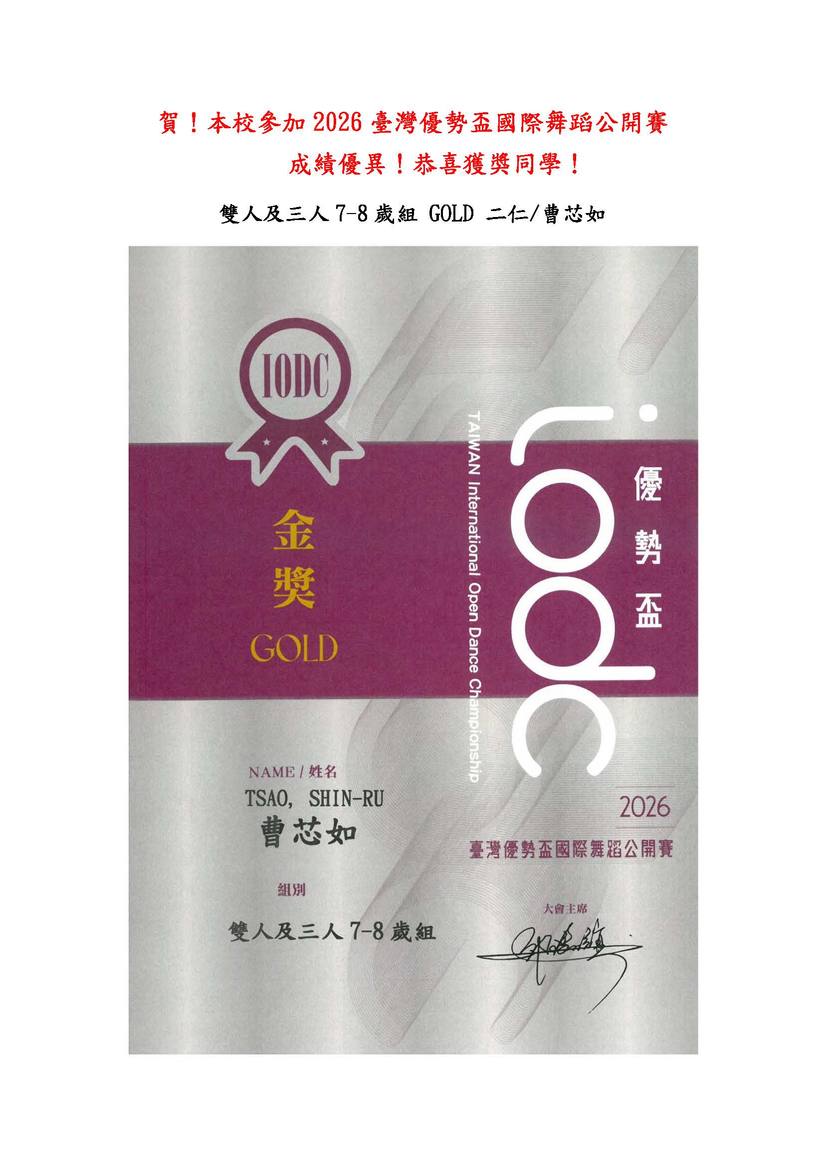 賀 本校參加2026臺灣優勢盃國際舞蹈公開賽 成績優異 恭喜獲獎同學