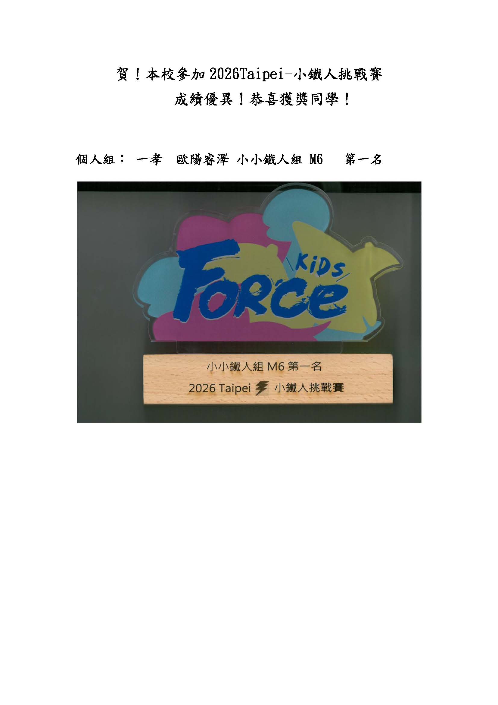 賀 本校參加2026Taipei-小鐵人挑戰賽 成績優異 恭喜獲獎同學