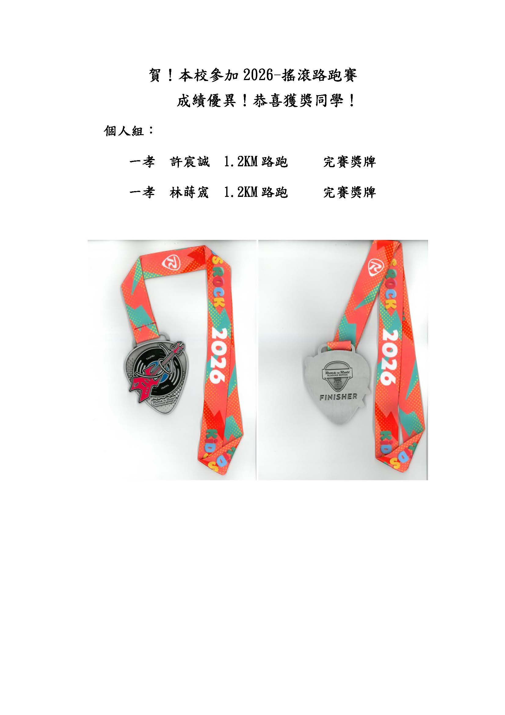 賀 本校參加2026-搖滾路跑賽 成績優異 恭喜獲獎同學