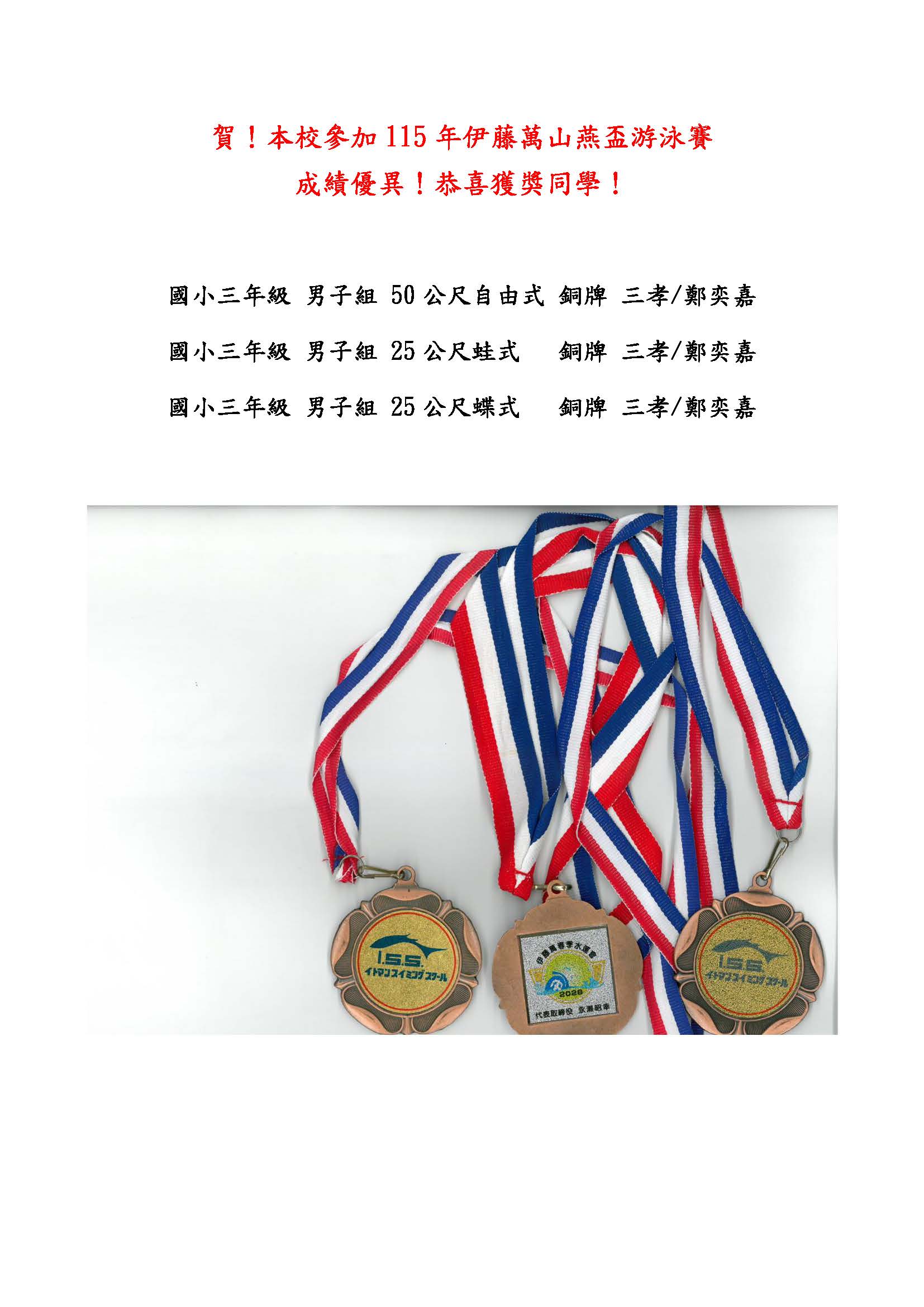 賀 本校參加115年伊藤萬山燕盃游泳賽 成績優異 恭喜獲獎同學