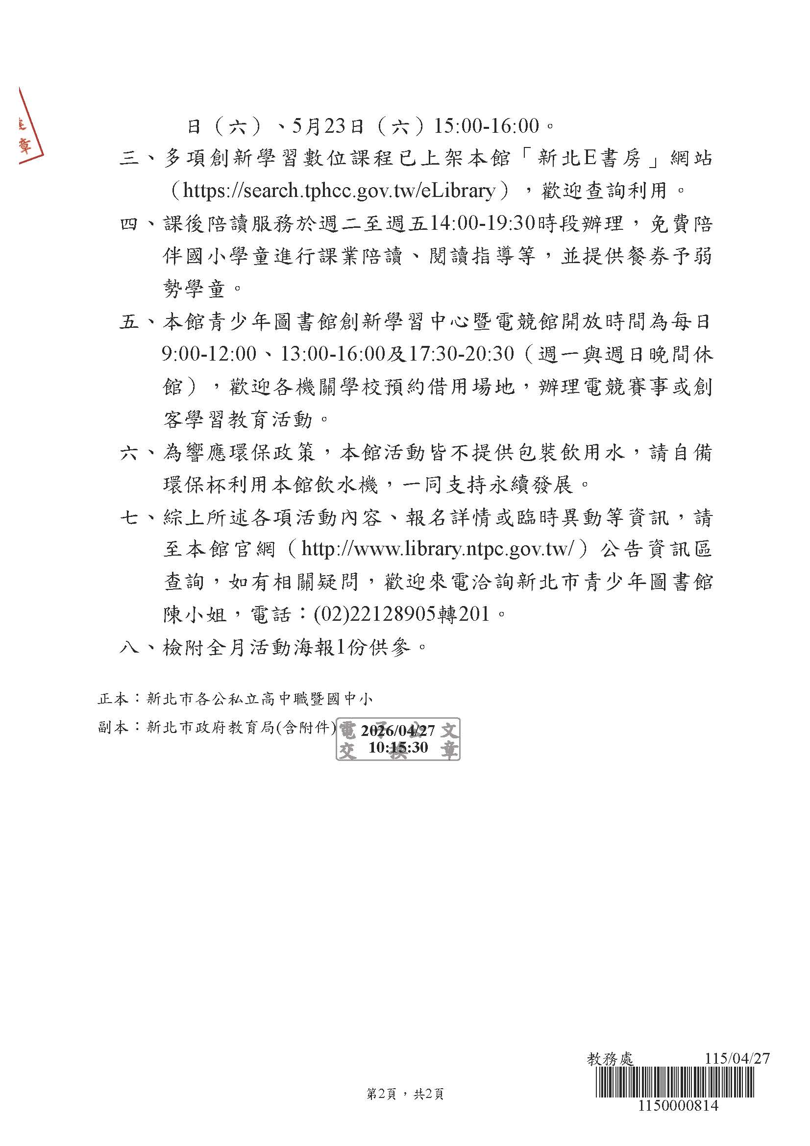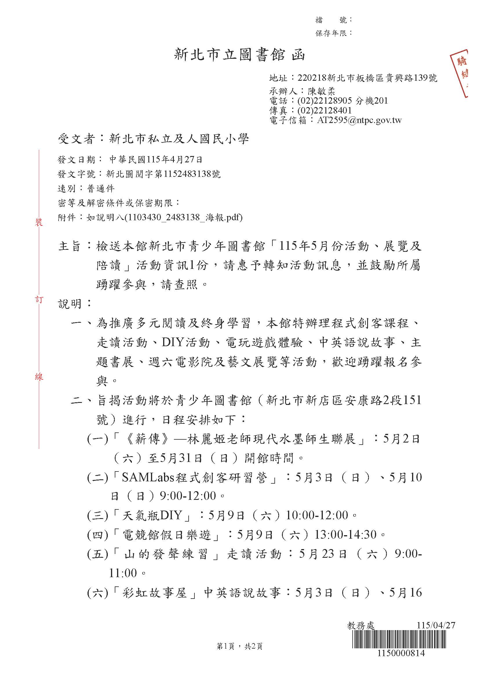 2026 4/27 新北市青少年圖書館「115年5月份活動、展覽及陪讀」活動資訊 1103430_2483138_海報.jpg 318.35 KBSPEED Super Desk_頁面_1.jpg 281.06 KBSPEED Super Desk_頁面_2.jpg 254.21 KB 返回